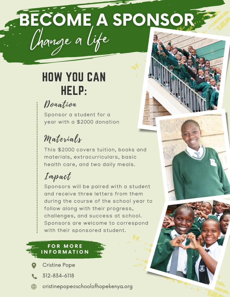 For a $2000 annual sponsorship gift, you can provide a student with tuition, books, uniforms, two daily meals, basic medical care, extracurricular activities and a mentoring program. You can correspond with your sponsored student and will receive a photo and three letters from your student each school year.
